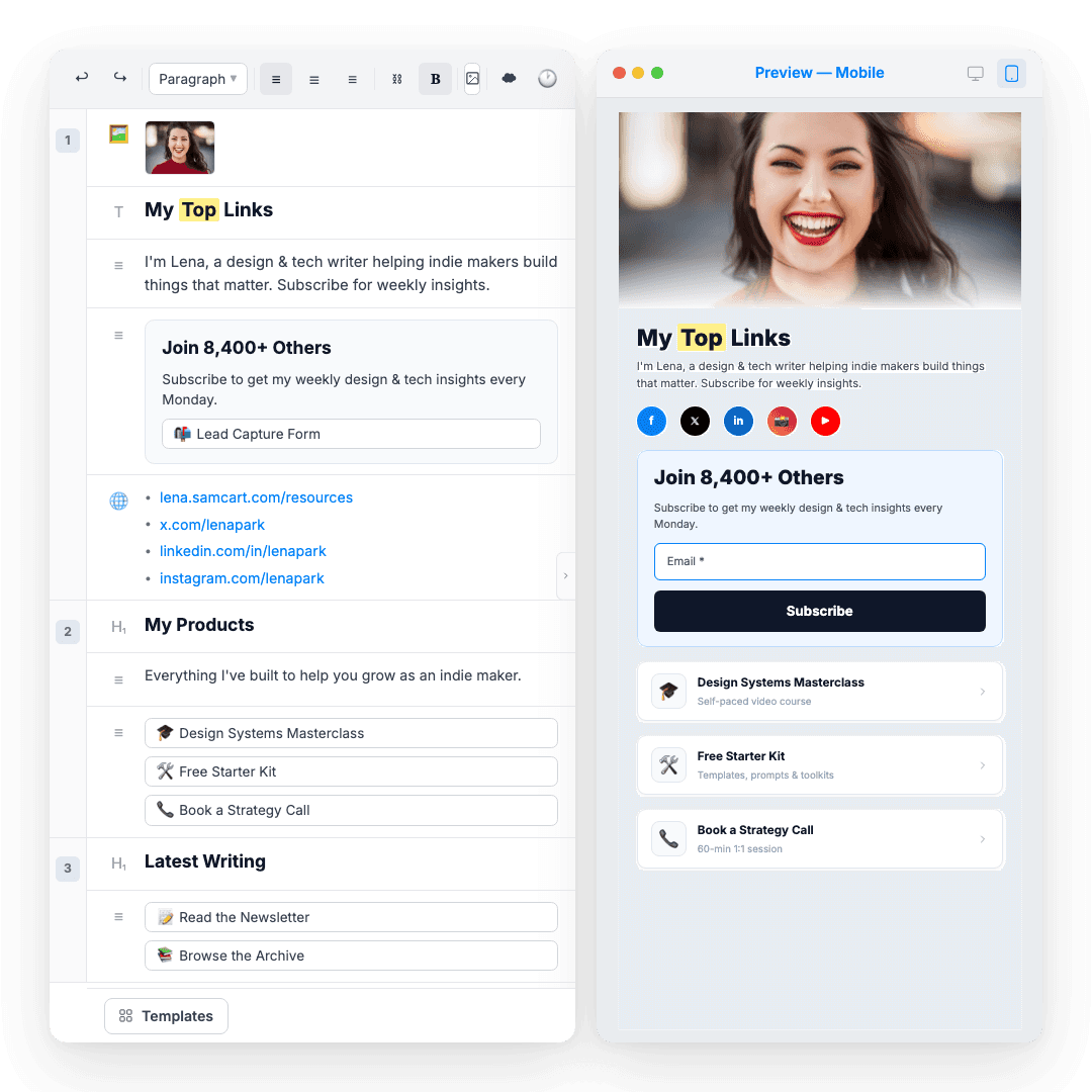 SamCart Pages includes a dedicated Link-in-Bio page type. Pick a template, add your links, products, and content, and publish to your custom domain. No separate tool needed.
