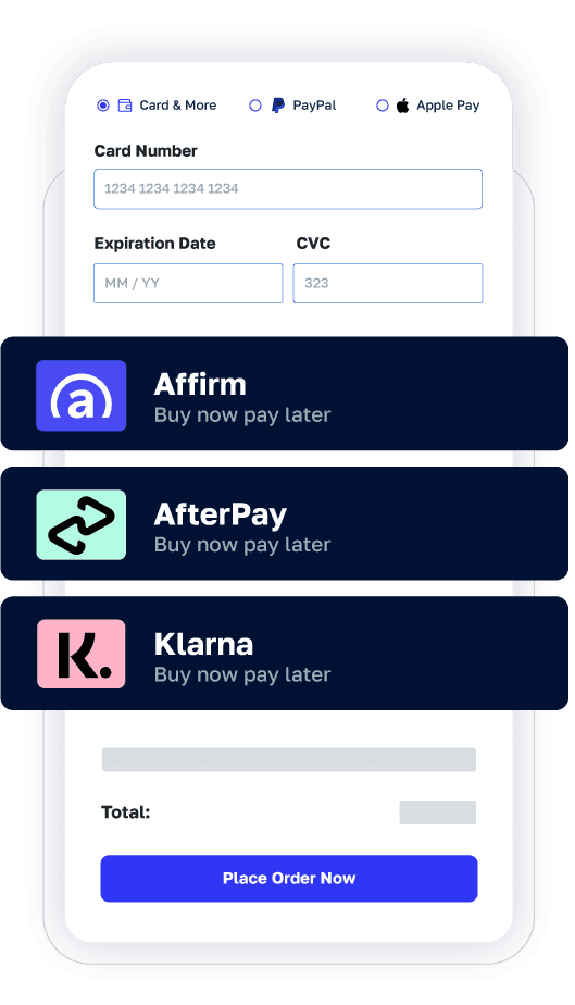 Through partnerships with Klarna, Affirm, and Afterpay, your customers can split their purchase into manageable, interest-free installments – yet you get paid, in full, at the time of purchase. Your BNPL partner will assume any risk of returns or declined payments, leaving you to retain your profits, close 30% more sales, and boost average order value by 40% or more.