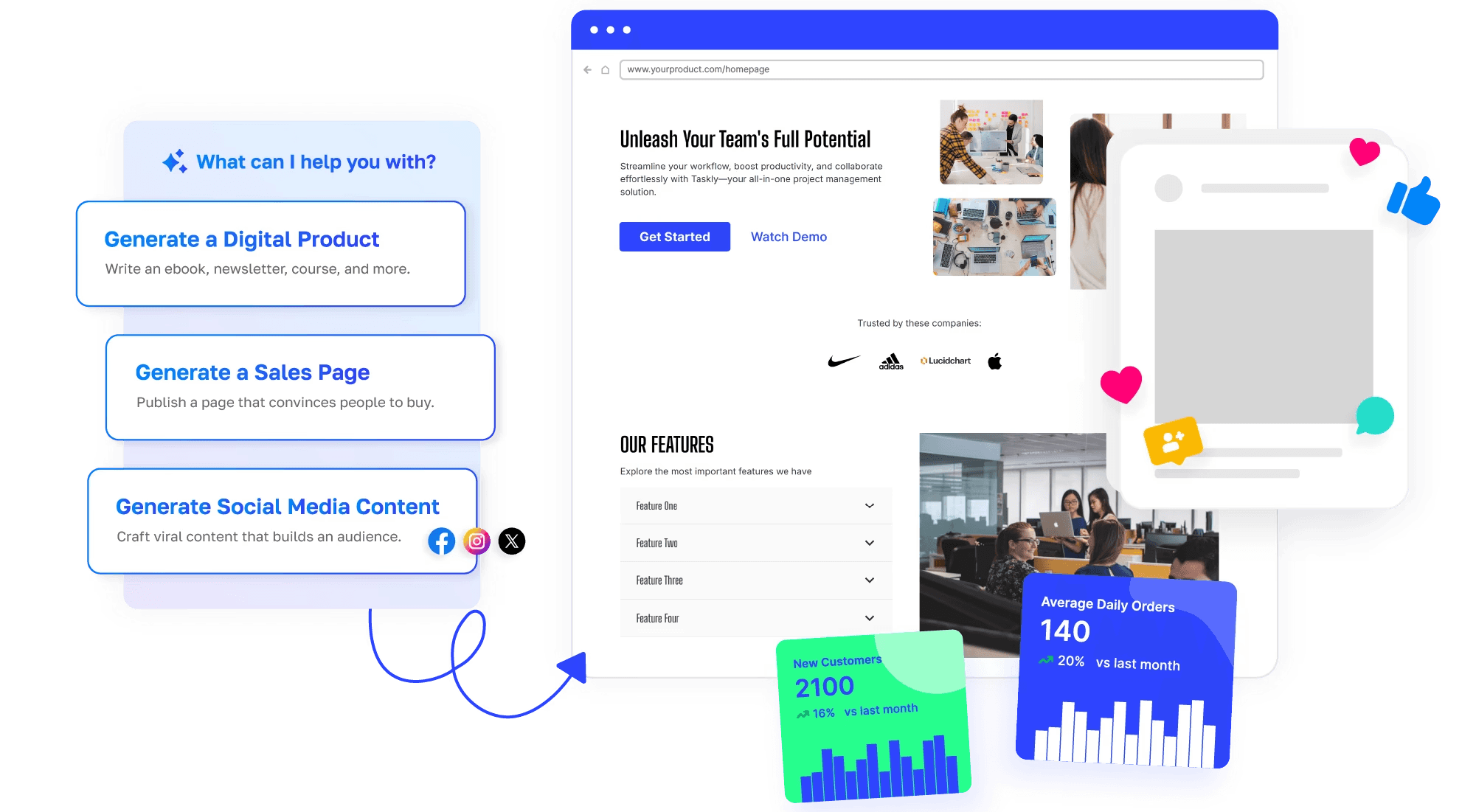 The key difference from generic AI tools: Pages AI understands conversion. It’s trained on patterns from over 100,000 successful sellers, so the pages it generates aren’t just pretty—they’re built to sell.