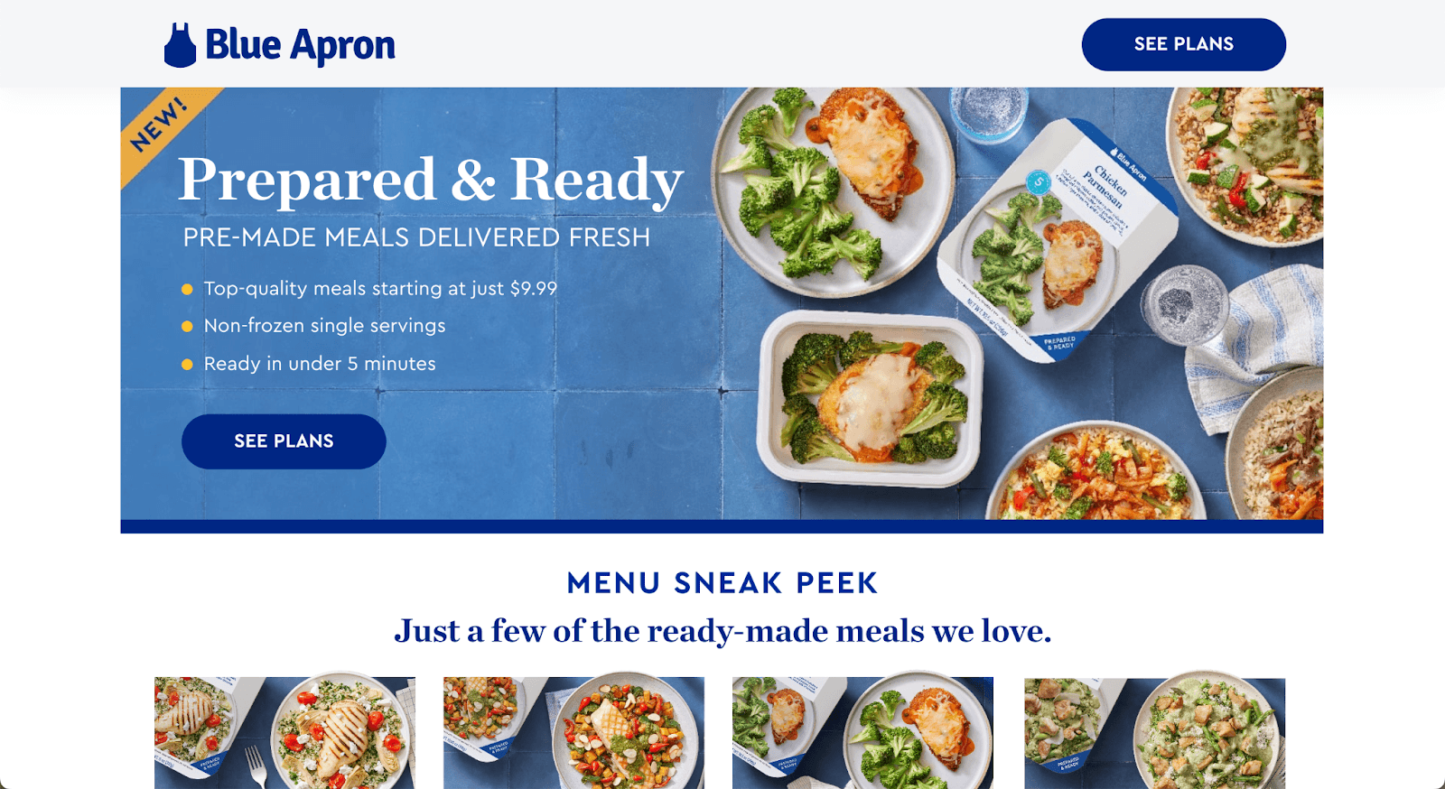 Blue Apron, a meal kit delivery service, creates a landing page that immediately draws users in with: