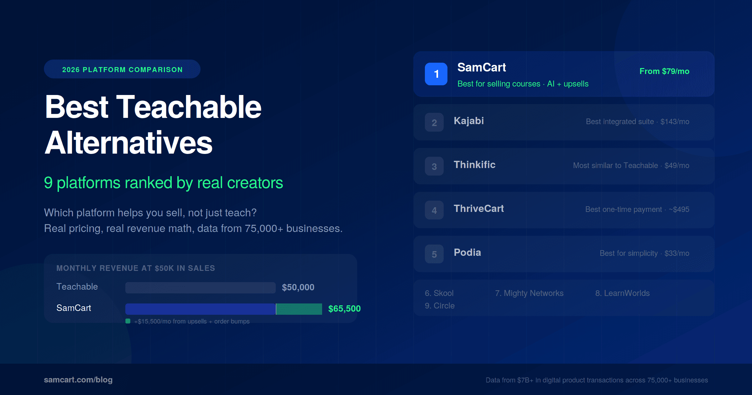Here's what most "Teachable alternatives" lists won't tell you: the real cost of your course platform isn't the monthly subscription. It's the combination of your subscription, transaction fees, and the revenue you leave on the table because your platform doesn't have built-in sales tools. SamCart data shows that one-click upsells increase average order value by 68%, and order bumps convert at 30-40%. Across 75,000+ businesses and $7B+ in digital product sales, the platforms that help creators sell (not just teach) consistently outperform those that focus on content delivery alone.