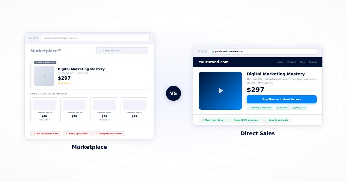 The trade-off: you are responsible for driving traffic. But the economics are dramatically better. One order bump on a direct checkout often generates more revenue than dozens of marketplace sales, with no platform fees eating the margin.