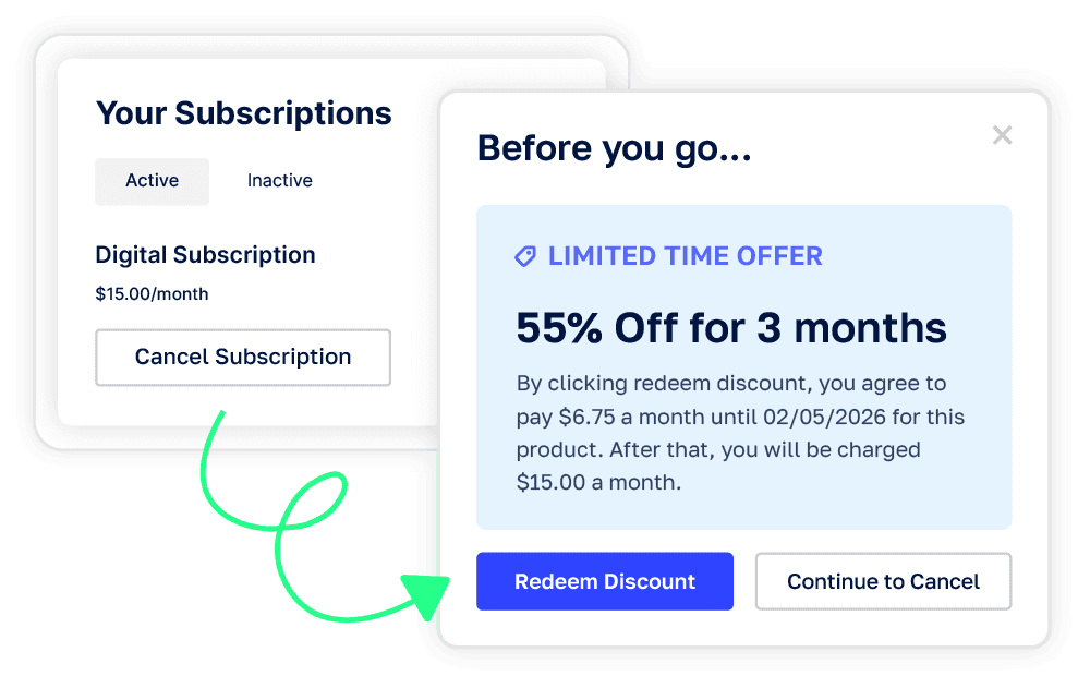 Stop losing subscribers to preventable cancellations. With SamCart’s Retention Offers, you can automatically intercept self-cancellation attempts and present customers with a personalized discount right at the moment they try to leave.