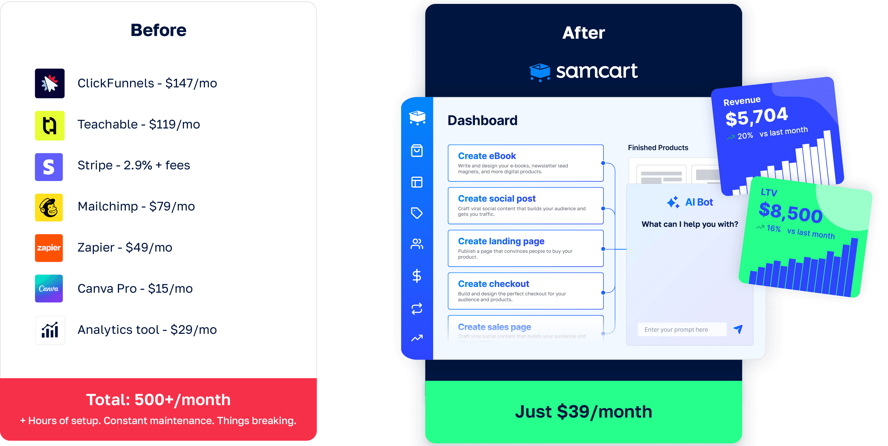If you're sick and tired of juggling 6 different tools that don't talk to each other, SamCart is for you.