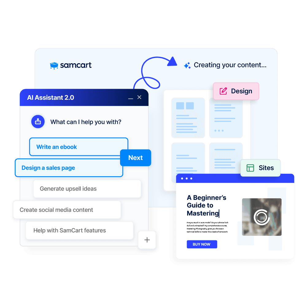 Watch AI write your e-book, design your sales page, and create checkout in real-time.