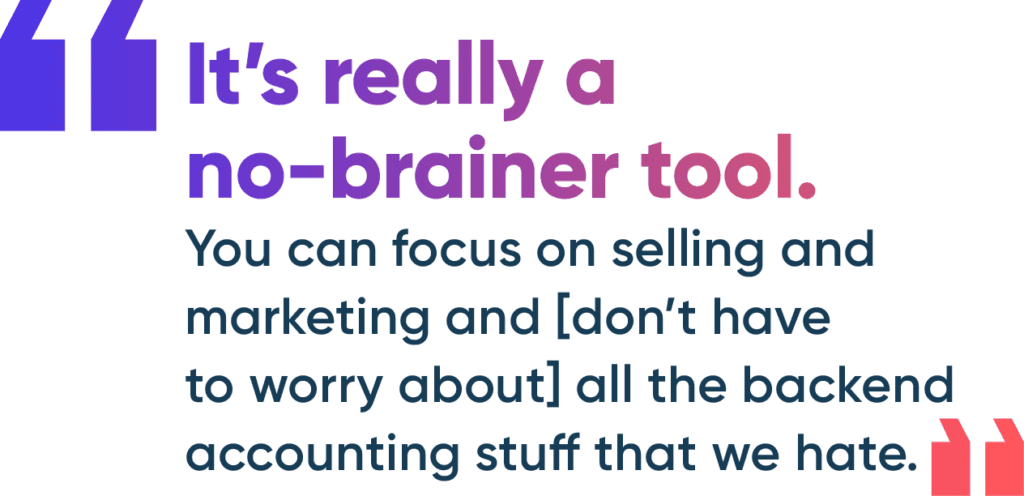 “It’s really a no-brainer tool. It helps you to simplify your business where you can focus on selling and marketing and all the backend accounting stuff that we hate, you don’t have to worry about that. They’re taking care of that part, and they’re making it fun to do.”