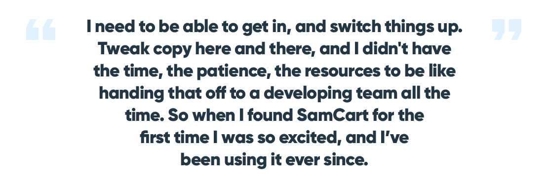 If you can’t tell by now, Ash is the type of person who likes to roll up her sleeves, and get her hands dirty. “I need to be able to get in, and switch things up. Tweak copy here and there, and I didn't have the time, the patience, the resources to be like handing that off to a developing team all the time. So when I found SamCart for the first time I was so excited, and I’ve been using it ever since.”