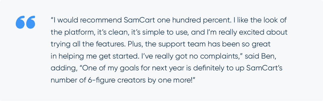 While keeping the course within reach for lower income families, SamCart’s PWYW feature also encourages the potential for upsells and building customer relationships. Ben mentioned that in the future, in addition to the complimentary digital certificates of completion his customers receive, he intends to create formal embossed paper certificates that customers can purchase upon completion of the course. “That’s still a minimal cost,” he said, “but if someone has only paid $20 in the first place, instead of $200, or $300 for the course, and they love the course, they might decide to go for the upsell and get the official paper certificate.” SamCart offers many opportunities for upsells and order bumps, giving Benjamin options while still keeping his course reasonably priced with the PWYW feature.