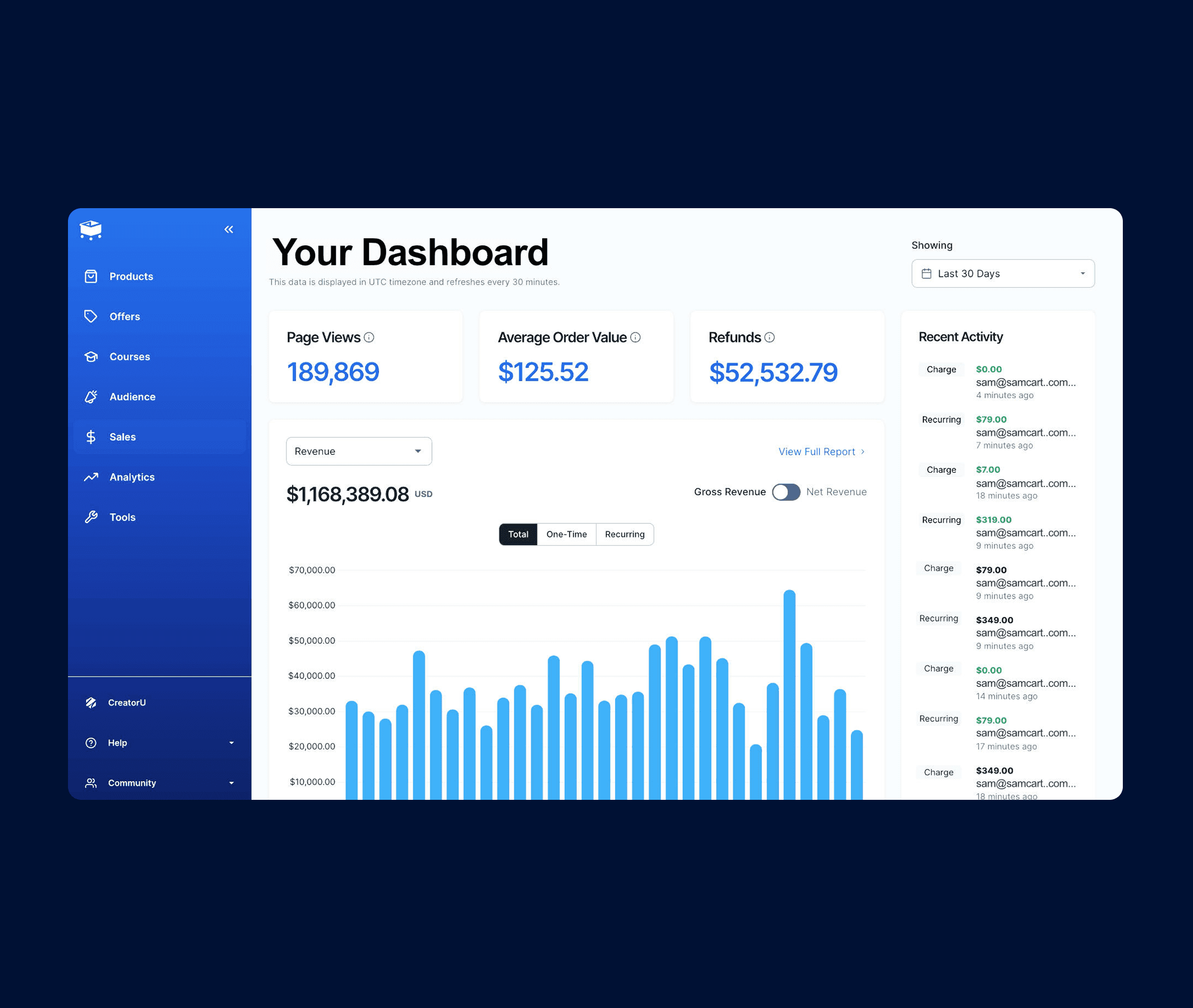 SamCart gives you a clear picture of your business with dashboards built for digital products. Track revenue in real time, understand which offers drive the most sales, and see the true lifetime value of your customers.