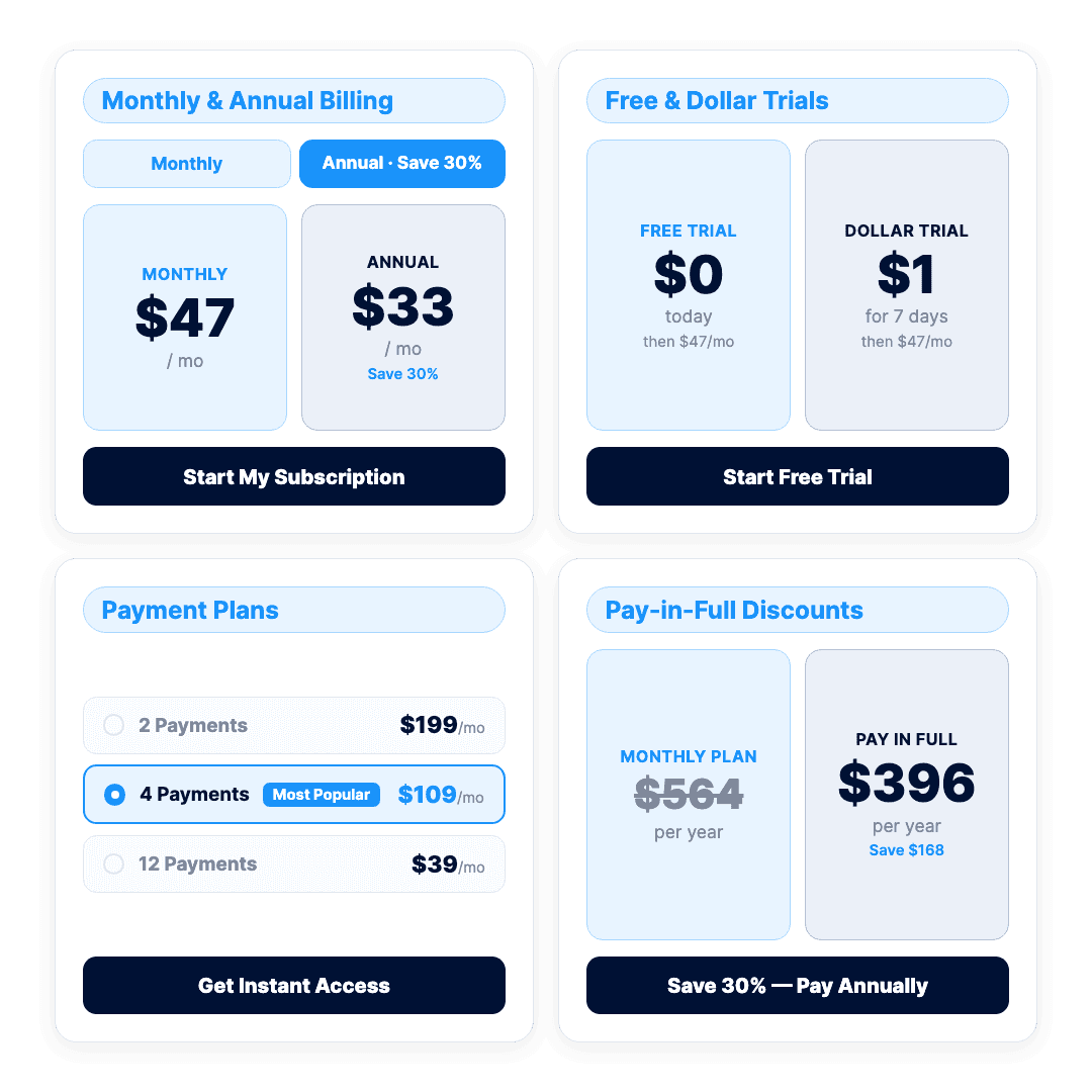 Monthly memberships, annual plans, free trials, dollar trials, payment plans, coupons, pay-in-full discounts. SamCart handles any billing structure you need. Set it up once and let it run.