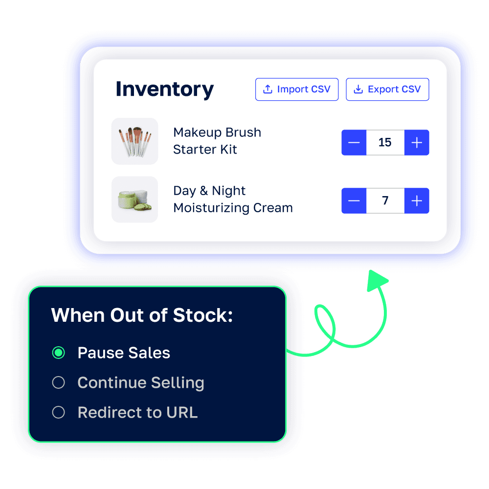 Track inventory levels in real-time. When stock is low, pause sales, continue selling, or build a waitlist so customers can be notified when items are back in stock—keeping demand high and sales flowing.