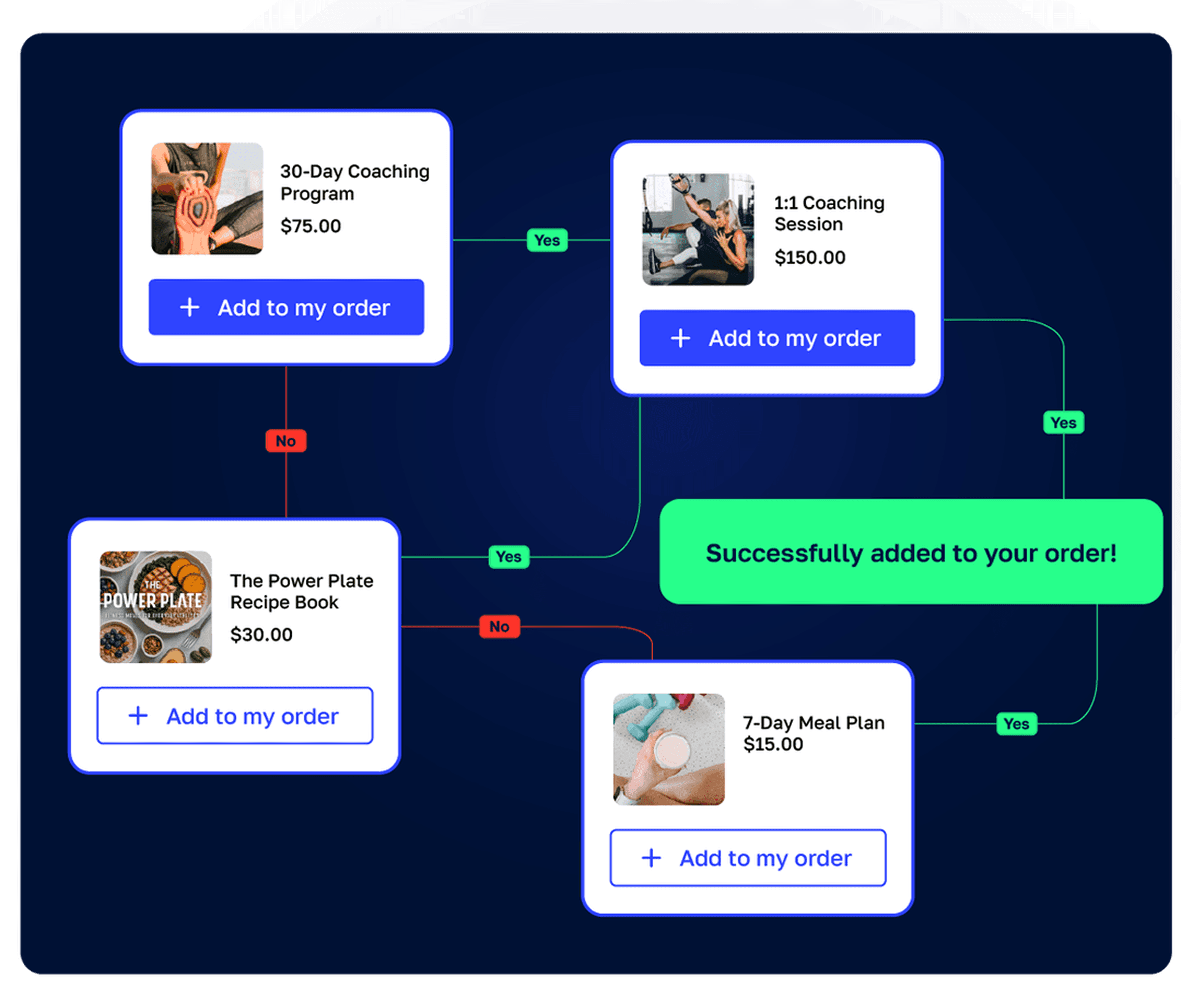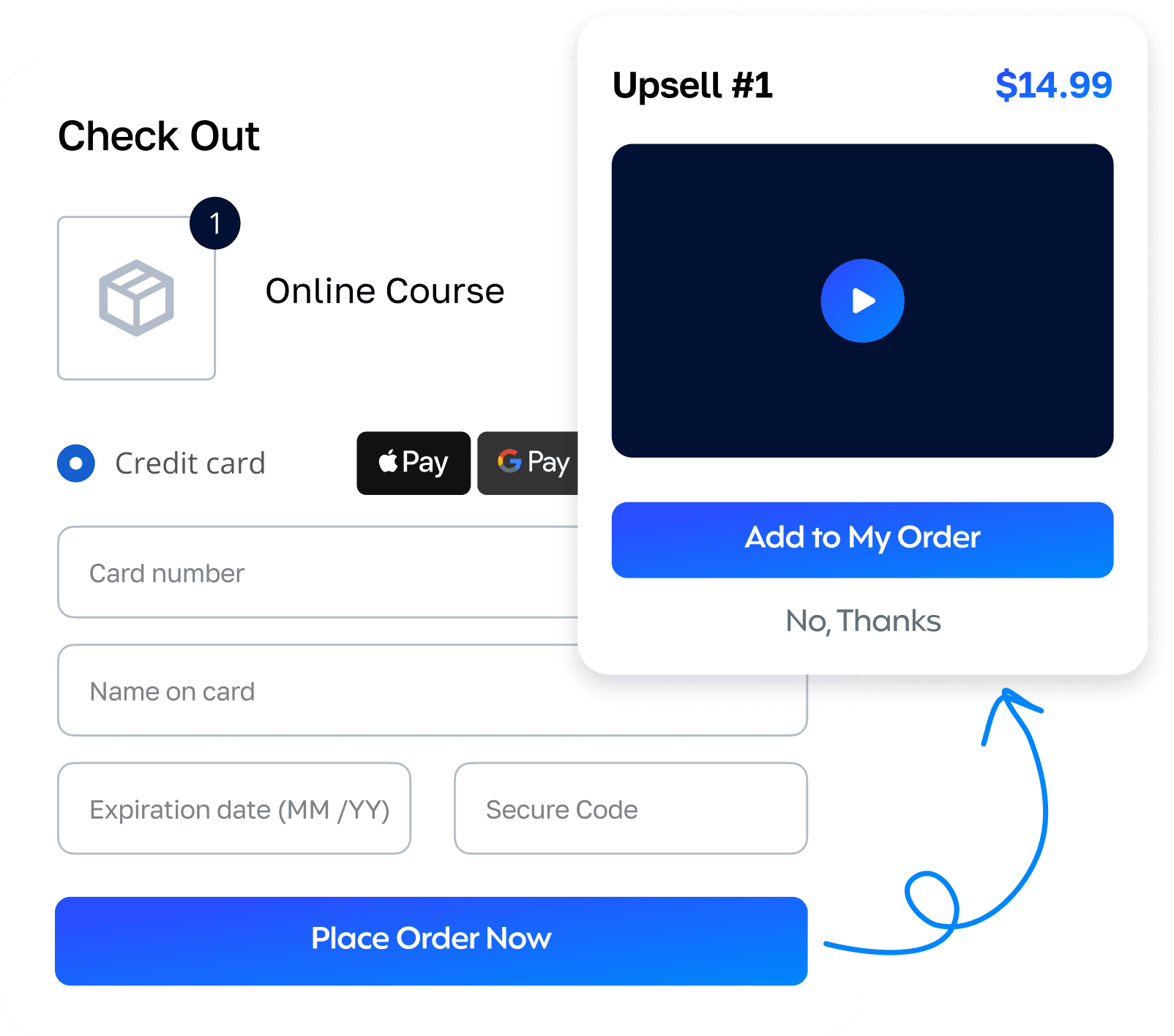 Effortlessly increase sales by offering customers the option to upgrade to more expensive subscriptions you offer, an annual plan, premium services, or coaching packages at checkout.