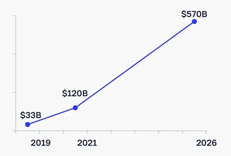 With stats like these, it’s no surprise that BNPL transaction volumes have been rapidly accelerating. Between 2019 and 2021, total BNPL transaction volumes surged from $33 billion to $120 billion – a nearly 400% increase⁸. By 2026, that number is expected to hit $570 billion.⁹