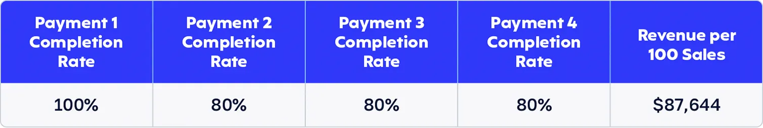 Say you have a $997 product that also has a payment plan of four equal payments of $297 each. Here’s how much revenue you’ll get per 100 sales for both options.